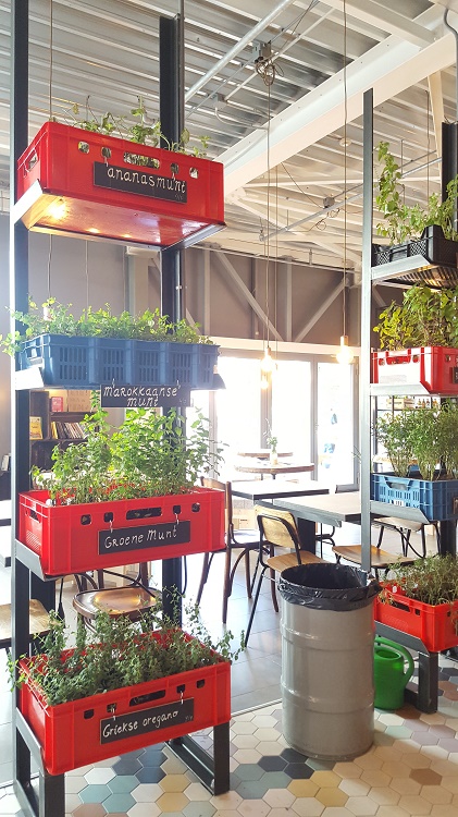 Nieuw en anders dan bij de andere vestiging is de ‘binnenpluktuin’ en daar word ik echt heel blij van. Je plukt hier geen bloemen, maar je eigen thee! De mooi gestapelde kratten staan niet zomaar ter decoratie (was op zich ook al heel leuk geweest), maar er groeien verschillende smaken thee in.