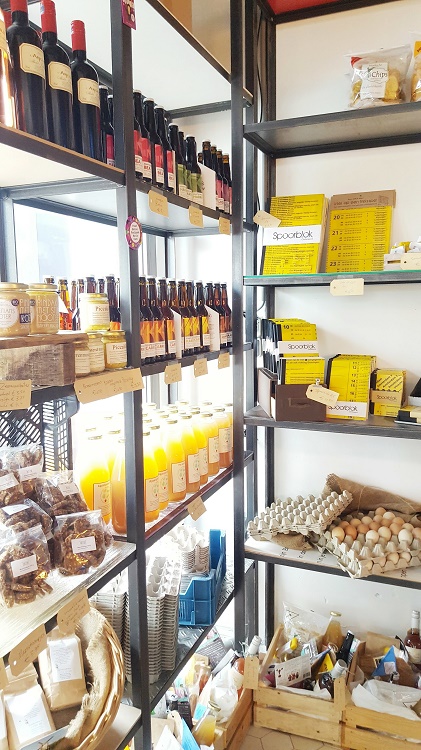 In de hoek van het nieuwe restaurant vind je de minimarkt vol regionale producten en verse groenten, met als nieuwkomer de overheerlijke chocolade van De Bonte Koe.